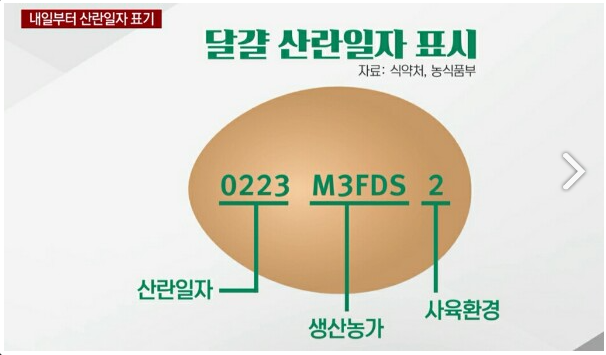 2) 계란 구입할 때는 산란 일자를 확인합니다. 시중에서 구입할 수 있는 계란에는 산란 일자가 적혀있습니다. 계란의 맨 앞 숫자 4개가 산란 일자입니다. 앞 두 가지는 월, 뒤에 두자리는 일이 적혀있습니다. 다음 다섯 가지 번호는 공가고유 번호입니다. 가축 사육법 허가 등록된 번호입니다. 마지막 한 자리 숫자는 닭의 사육 환경입니다. 사육환경은 1~4까지 표기됩니다. 숫자 1은 방사 사육을 의미합니다. 숫자 2는 자유롭게 다니면서 생활한 닭, 숫자 3은 케이지보다는 더 개선된 생활은 한 닭, 숫자 4는 많은 비좁은 밀집형 케이지에서 생활한 닭의 환경에 따라 숫자가 달라집니다. 세척하지 않은 계란은 상온에서 유통됩니다. 가정에서 냉장 보관할 때는 세척해서 보관해야 하며, 실온 보관 시 산란일로 부터 7일, 냉장 보관 시 3주 안에 먹는 것을 추천하고 있습니다.