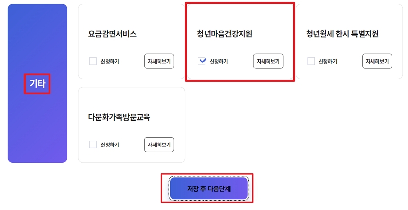 복지로 로그인 > 서비스 신청> 복지서비스 신청 >복지급여 신청> 기타 > 청년마음건강지원
