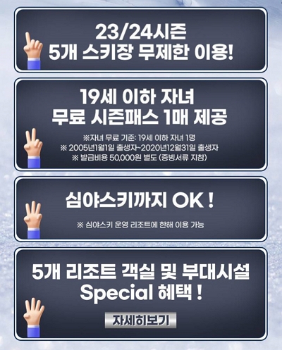 용평 리조트 시즌권을 구입할 수 있습니다. 11월 20일 까지 구매 할 수 있으니 참고하시길 바랍니다. 또한 5개 스키장을 무제한으로 이용할 수 있다는 장점을 가지고 있습니다.