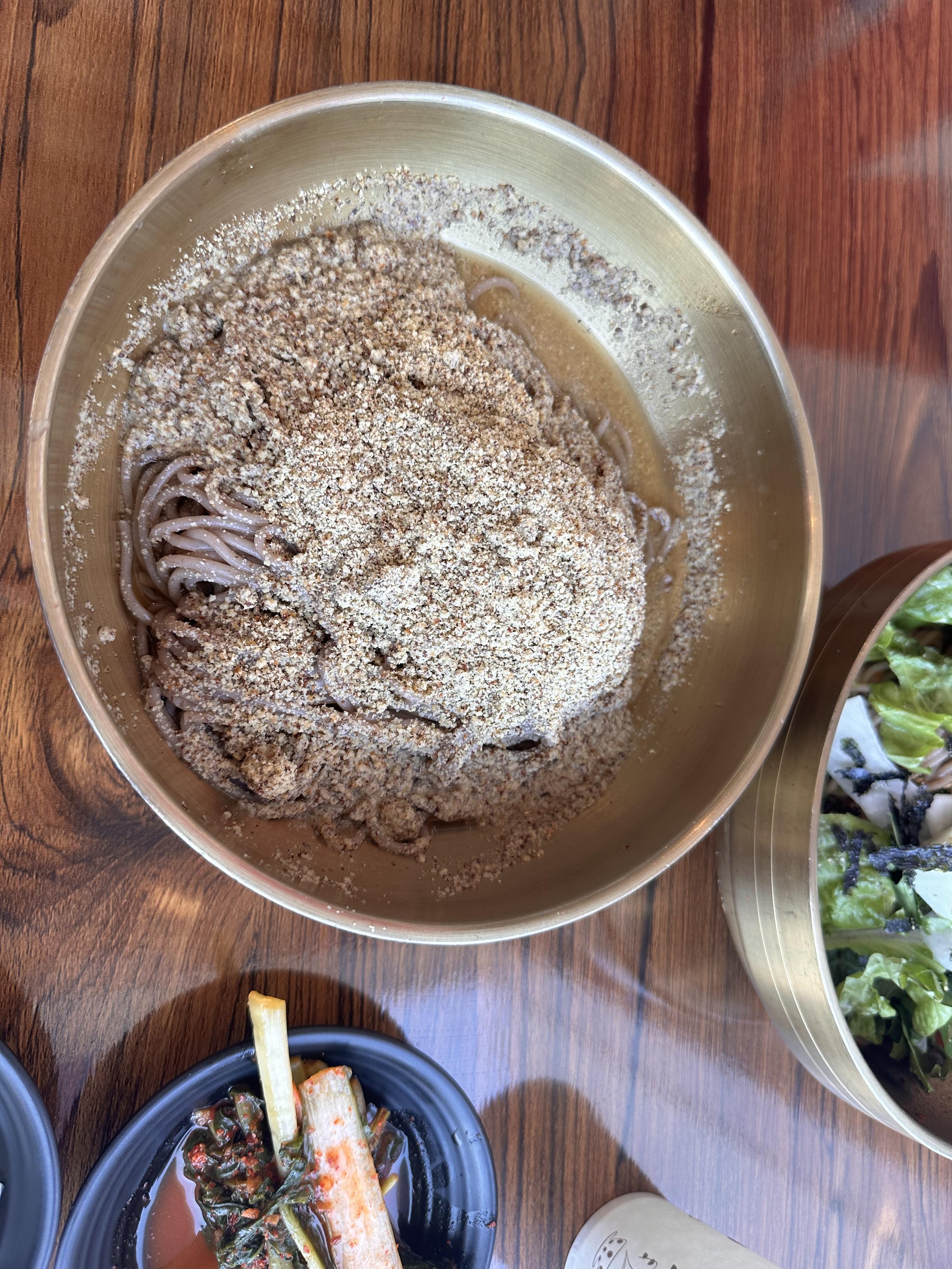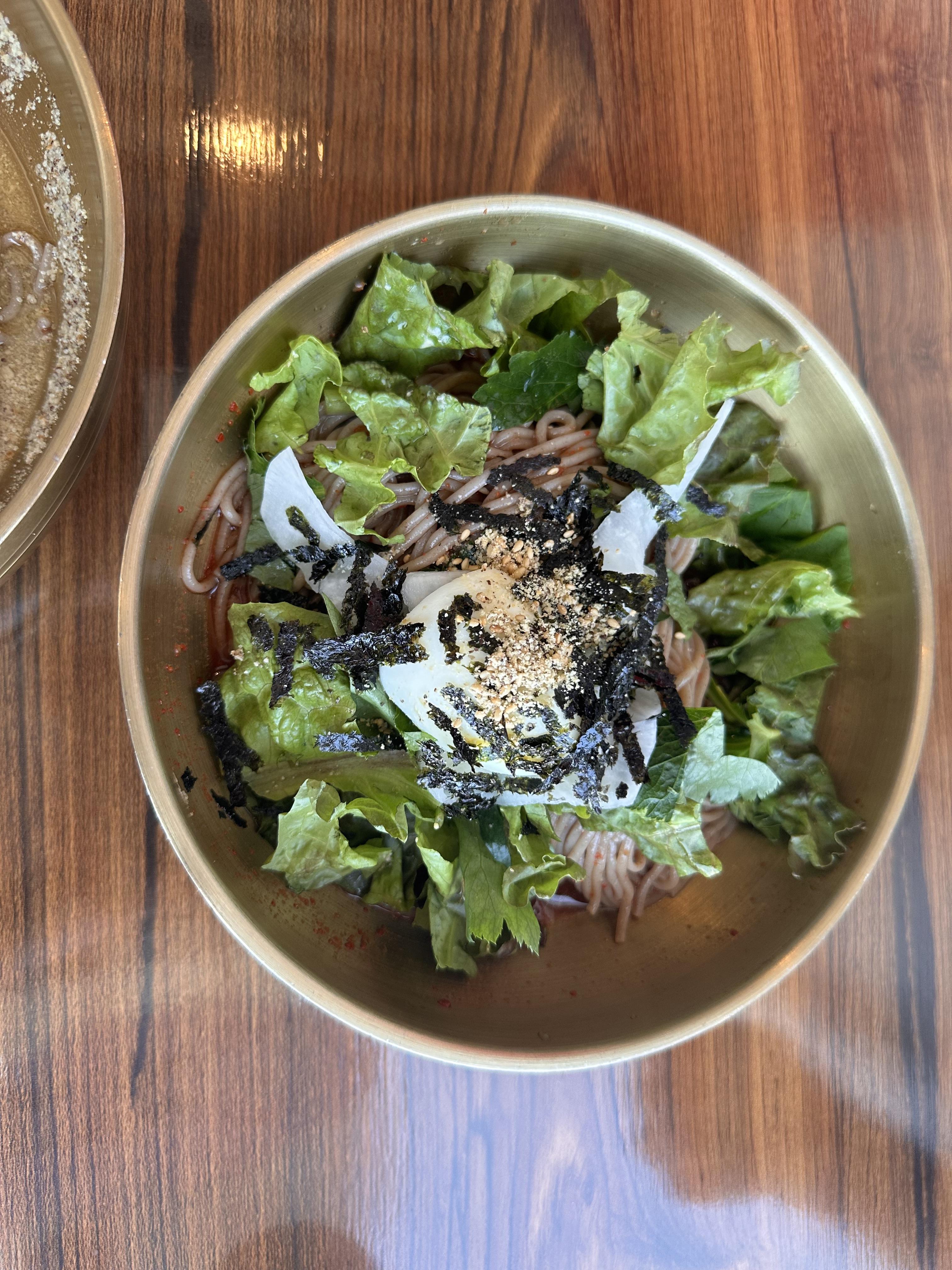 | 들깨 막국수 10점 만점 8.5 맛있습니다. 구수하고 들깨가 많이 들어가서 좋았습니다. 막국수 먹으러 근처 가면 먹을듯 합니다. 비빔 막국수는 조금 아쉽습니다. 10점 만점 6.5점, 양념이 많이 심심한 듯한 느낌이 들었습니다. |