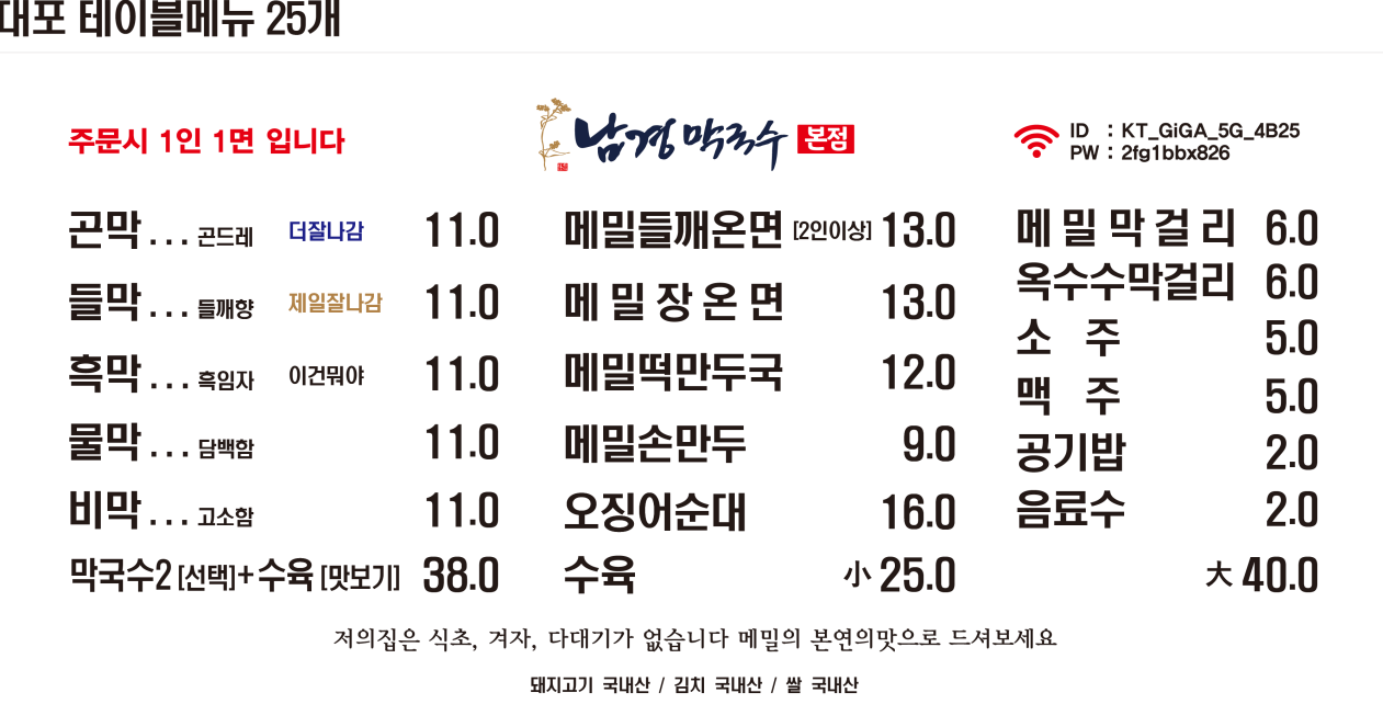 | 막국수 2개 + 수육(맛보기) | 38,000원 수육(16000원) |