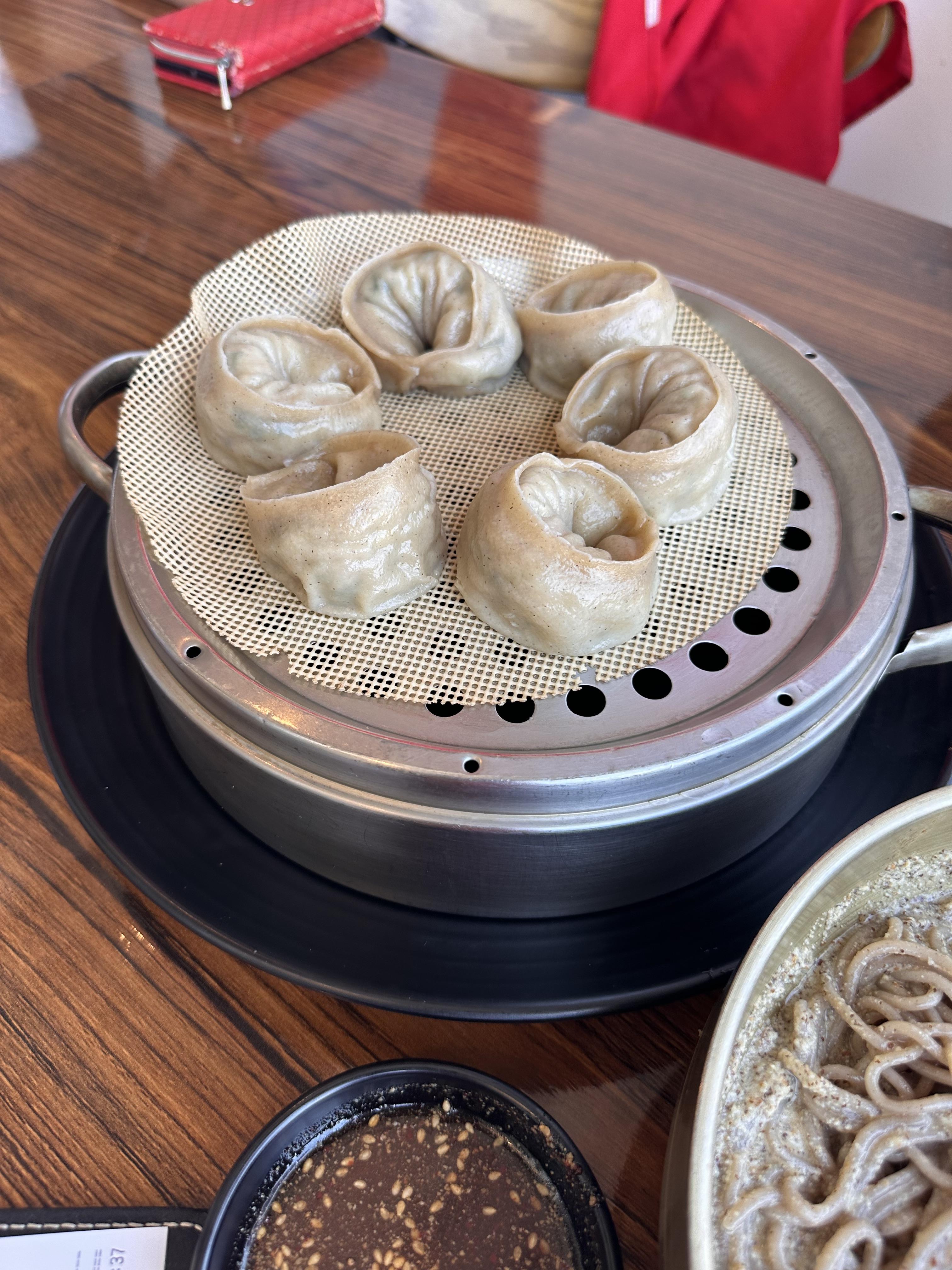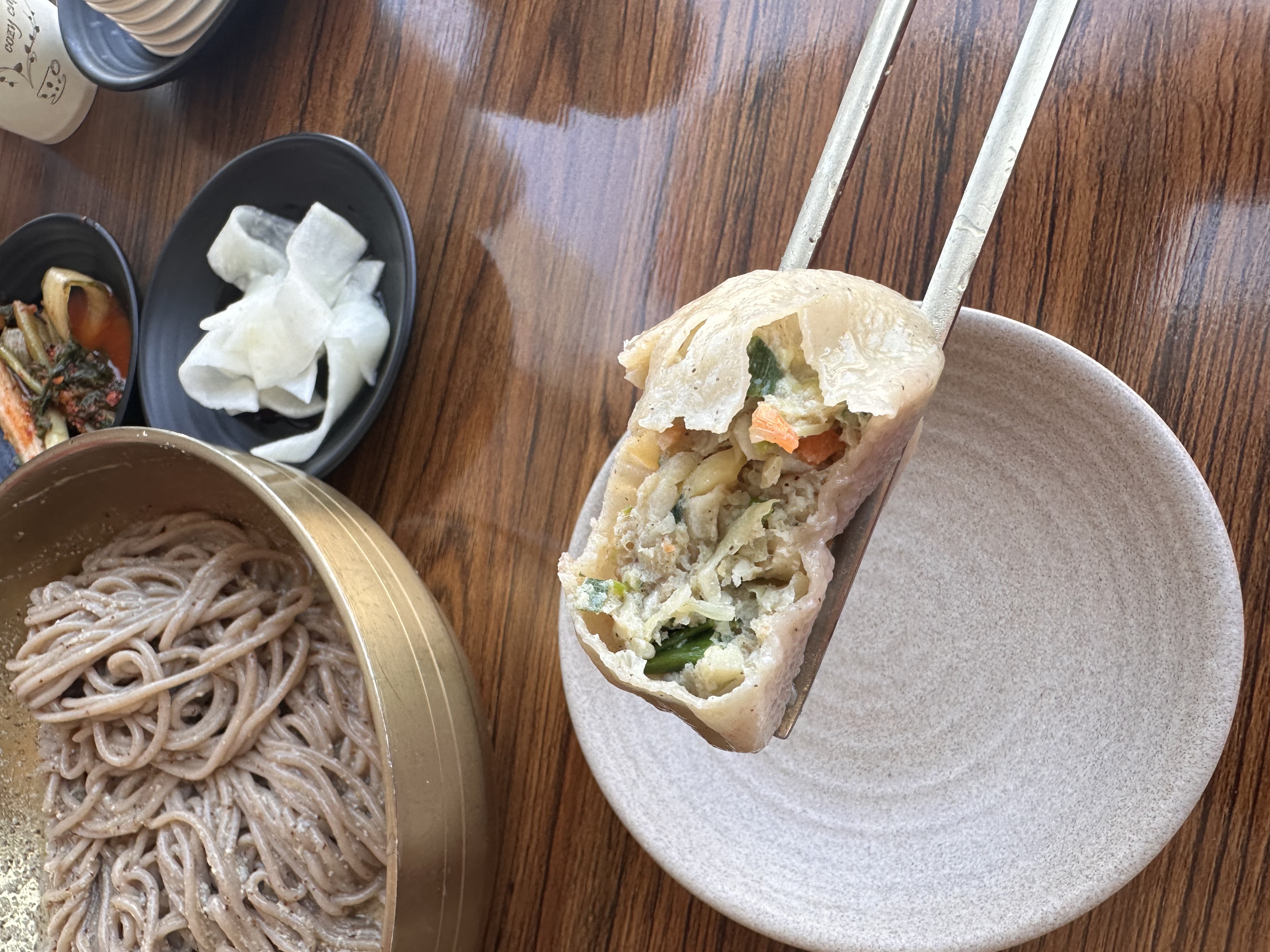 메밀 만두도 같이 먹었는데 안에 야채가 많이 들어있는 고기 만두 입니다. 그냥 무난~ 했던 맛으로 원래 비빔 막국수가 짜면 만두 먹으면서 어울릴 것 같아서 시켰는데 비빔 막국수가 심심해서 만두는 그냥 간장에 찍어 먹었습니다.