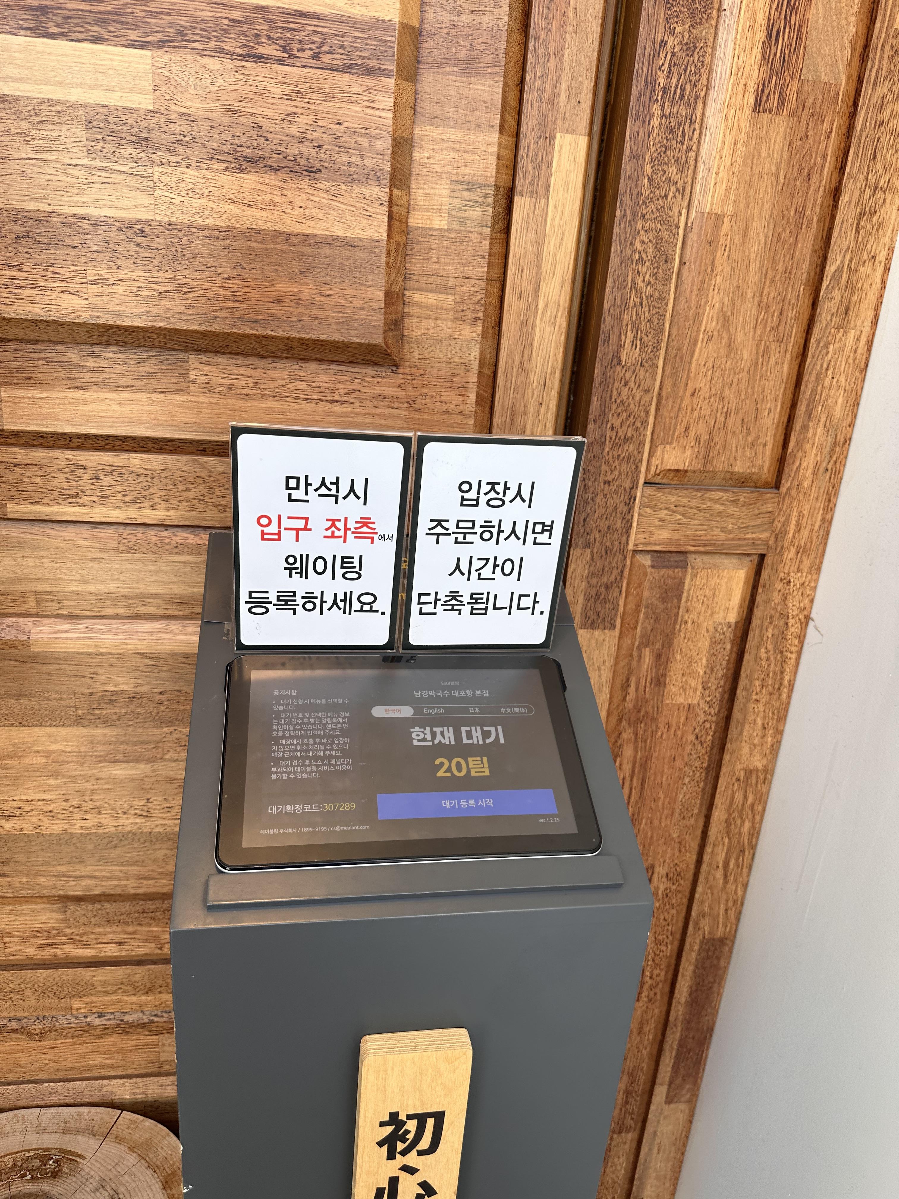 오전 11시 반쯤 도착했는데 웨이팅 20팀 있었는데 20분 정도 대기 하고 들어갔습니다.