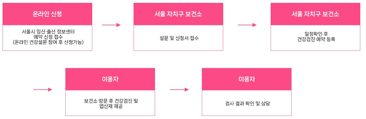 서울시 사업 해당 지자체 거주자 이며 해당 지자체 사업소에 근무자인 경우 ‘서울시 임신출산 정보센터’의 모자보건 서비스를 통해 주민등록 주소 기준 또는 회사주소 기준 자치구로 온라인 신청이 가능 합니다.